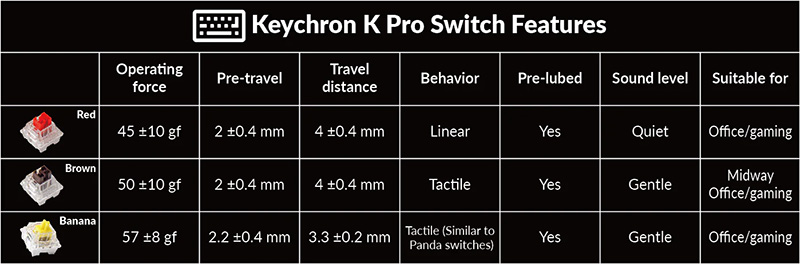 Switch keychron K Pro được tối ưu hóa khuôn switch giúp giảm thiểu tình trạng lắc lư hơn so với các switch cơ tiêu chuẩn và mang đến cảm giác gõ mượt mà hơn trên mỗi lần nhấn. Bên cạnh đó, switch đã được lube trước khi xuất xưởng để đảm bảo độ mượt tốt nhất khi gõ.