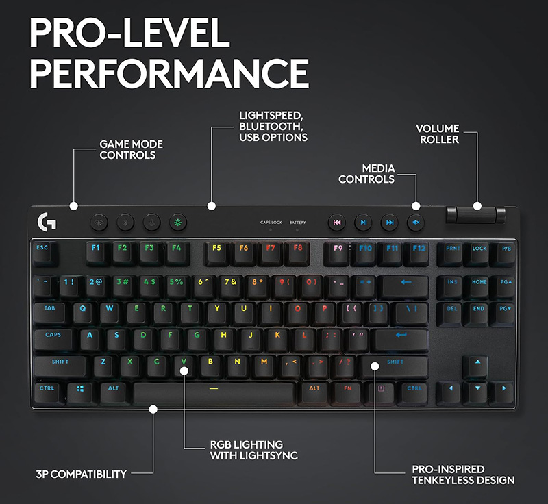 Với các phím có thể lập trình, đèn nền RGB LIGHTSYNC, Gaming mode và chức năng Game Mode Lock mới cùng các nút điều khiển phương tiện và núm xoay âm lượng, Bàn phím cơ không dây Logitech G PRO X TKL LIGHTSPEED cho phép bạn kiểm soát trên hành trình đi tới chiến thắng.