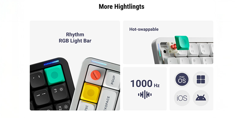 Đảm nhận vai trò tiếp xúc với các ngón tay là bộ keycap đúc kép PBT Doubleshot, chống mài mòn và không bao giờ bị bóng dầu sau thời gian dài cày cuốc. Không chỉ chú trọng vật liệu, Air100 V3 còn là một món đồ trang trí nghệ thuật nhờ hệ thống LED RGB rực rỡ từng phím. Khi kết hợp cùng hai dải sáng nhịp điệu Rhythm RGB Light Bar bên hông thân máy và module núm xoay (Knob - được hãng tặng kèm cả 2 form High/Low-Profile để bạn tự thay), chiếc bàn phím sẽ biến góc máy của bạn trở nên sống động và mang đậm cá tính riêng.