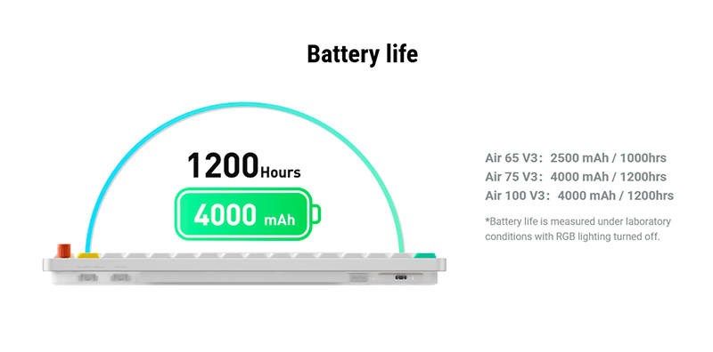 Cung cấp năng lượng cho hệ thống đồ sộ này là viên pin sạc dung lượng "khủng" 4000 mAh. Ở chế độ tắt đèn nền, bạn có thể làm việc liên tục lên đến 1000 giờ – một con số đáng kinh ngạc cho phép bạn quên đi chiếc cáp sạc trong nhiều tháng liền. Ngay cả khi bật LED RGB rực rỡ, máy vẫn hoạt động bền bỉ suốt 73 giờ. Bên dưới gầm máy trang bị chân đế giúp bạn dễ dàng điều chỉnh độ cao, giúp hạn chế tình trạng đau mỏi cổ tay khi làm việc.