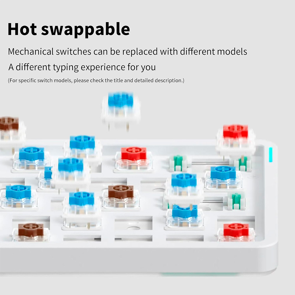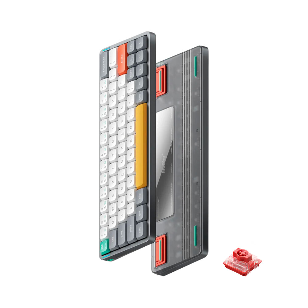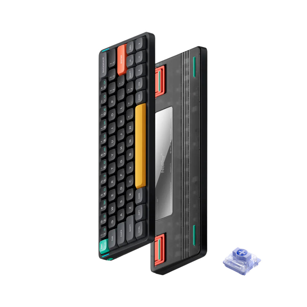 Bàn phím hỗ trợ hot-swap, kèm 4 switch dự phòng trong hộp, cho phép thay đổi nhanh chóng mà không cần hàn. Dòng NuPhy Switches như Moss tactile với hành trình 16.5mm và Cowberry linear pre-travel 1.2mm mang đến cảm giác gõ đa dạng; đồng thời, các switch Gateron Red, Blue, Brown cũng được nâng cấp với khuôn chính xác và pre-lube mượt mà. Hệ thống RGB backlight và sidelight với 40 chế độ, thanh LED bên trái hiển thị Caps Lock và chế độ kết nối, bên phải hiển thị pin và chế độ hệ thống, tạo hiệu ứng ánh sáng sống động, tùy biến qua VIA.