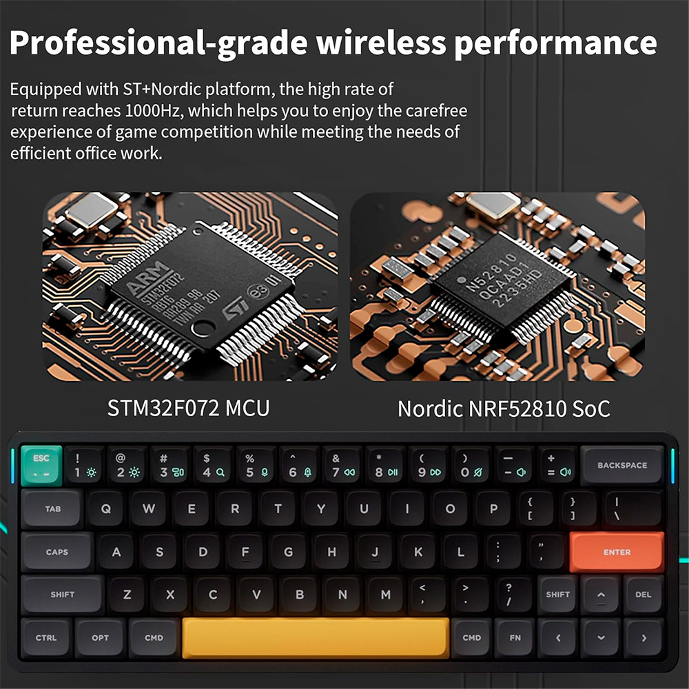 Bàn phím cơ không dây Nuphy Air60 V2 RGB Hotswap (Nuphy Sw) không chỉ nằm ở con số polling rate 1000Hz ấn tượng, mà còn ở những công nghệ tinh vi bên trong. Để đảm bảo độ trễ thấp nhất, NuPhy đã kết hợp chip Nordic NRF52810 SoC tiên tiến với bộ vi xử lý STM32F072 hiệu suất cao. Nhờ đó, mỗi cú gõ phím của bạn đều được truyền đi gần như ngay lập tức, mang lại trải nghiệm mượt mà và chính xác tuyệt đối trong mọi tình huống. Đây chính là minh chứng cho sự tỉ mỉ của NuPhy, biến những thông số kỹ thuật thành hiệu năng thực tế, giúp bạn luôn dẫn đầu trong công việc và giải trí.