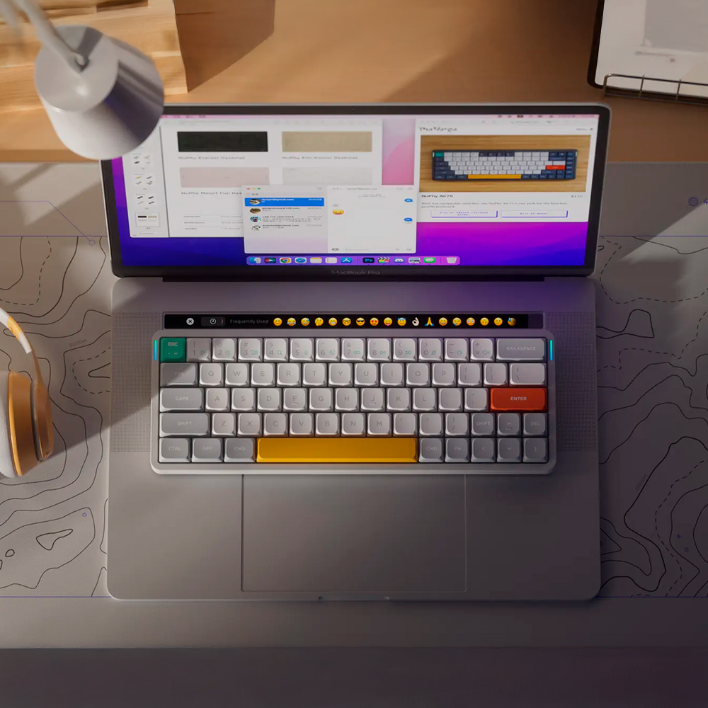 Bàn phím cơ không dây Nuphy Air60 V2 RGB Hotswap (Nuphy Sw). Với sự hỗ trợ của chân đế AirFeet cải tiến, chiếc bàn phím nhỏ gọn này có thể dễ dàng đặt lên trên bàn phím của hầu hết các mẫu laptop hiện nay. Dù kích thước khiêm tốn, Air60 V2 vẫn được thiết kế một cách tinh tế, chừa đủ không gian ở phía trên để bạn thoải mái sử dụng các tính năng đặc biệt của laptop như Touch ID, Touch Bar hay camera, không gây bất tiện trong quá trình làm việc. Nhờ vậy, bạn có thể tận hưởng cảm giác gõ phím chuyên nghiệp mọi lúc mọi nơi, mà không phải hy sinh sự tiện lợi của chiếc laptop. Danh sách laptop tương thích:
