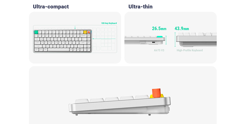 Với độ mỏng ấn tượng chỉ 13.2mm, Air75 V3 đã được tinh chỉnh để loại bỏ phần thừa không cần thiết, mang lại thiết kế gọn nhẹ hơn nhưng vẫn giữ nguyên độ chắc chắn. Chiều cao giảm chỉ vài mm giúp bạn dễ dàng bỏ vào balo, túi xách và mang theo bên mình mà không cảm thấy cồng kềnh. Dù làm việc ở quán cà phê, văn phòng hay trong những chuyến đi xa, chiếc bàn phím này luôn sẵn sàng đồng hành cùng bạn mọi lúc mọi nơi.