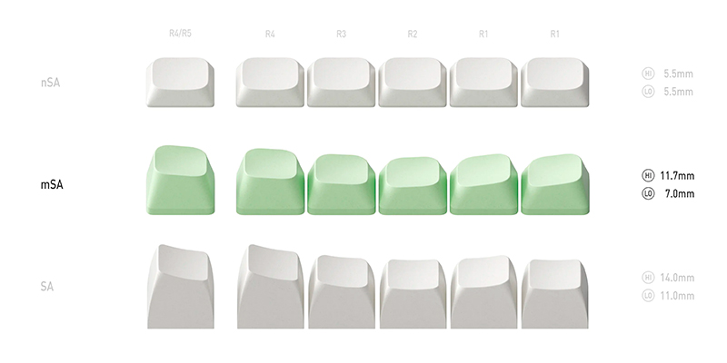 Lần đầu tiên, profile keycap mSA hoàn toàn mới được giới thiệu trên bàn phím cơ không dây Nuphy Halo75 V2 RGB Hotswap (Nuphy Sw) sau hơn hai năm phát triển. Đây là phiên bản high-profile được tinh chỉnh từ chiều cao của SA profile để tăng tính công thái học, với bề mặt tròn và lớn hơn cho cảm giác gõ thoải mái. Điểm độc đáo nhất chính là các thanh định vị (homing bar) có khả năng phát sáng, tận dụng LED mạch xuôi để chiếu sáng vừa đủ, giúp bạn định vị phím dễ dàng trong bóng tối mà không hề gây mất tập trung.