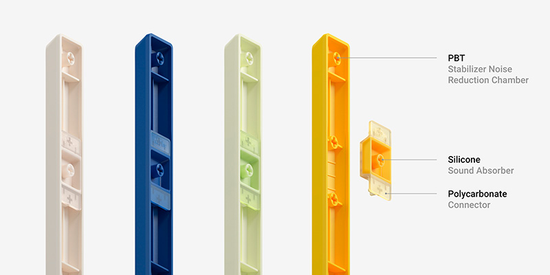 Các thanh định vị phát sáng được chế tạo bằng quy trình ép phun ba lớp (triple-shot) tinh vi, giúp bạn dễ dàng tìm thấy phím trong mọi điều kiện ánh sáng mà không ảnh hưởng đáng kể đến thời lượng pin nhờ tính năng tiết kiệm điện tích hợp. Không chỉ vậy, công nghệ GhostBar trứ danh cũng được nâng cấp lên profile mSA, sử dụng các khoang rỗng bên trong để triệt tiêu hoàn toàn âm thanh khó chịu của phím spacebar, mang lại sự hài hòa và nhất quán trên toàn bộ bàn phím.