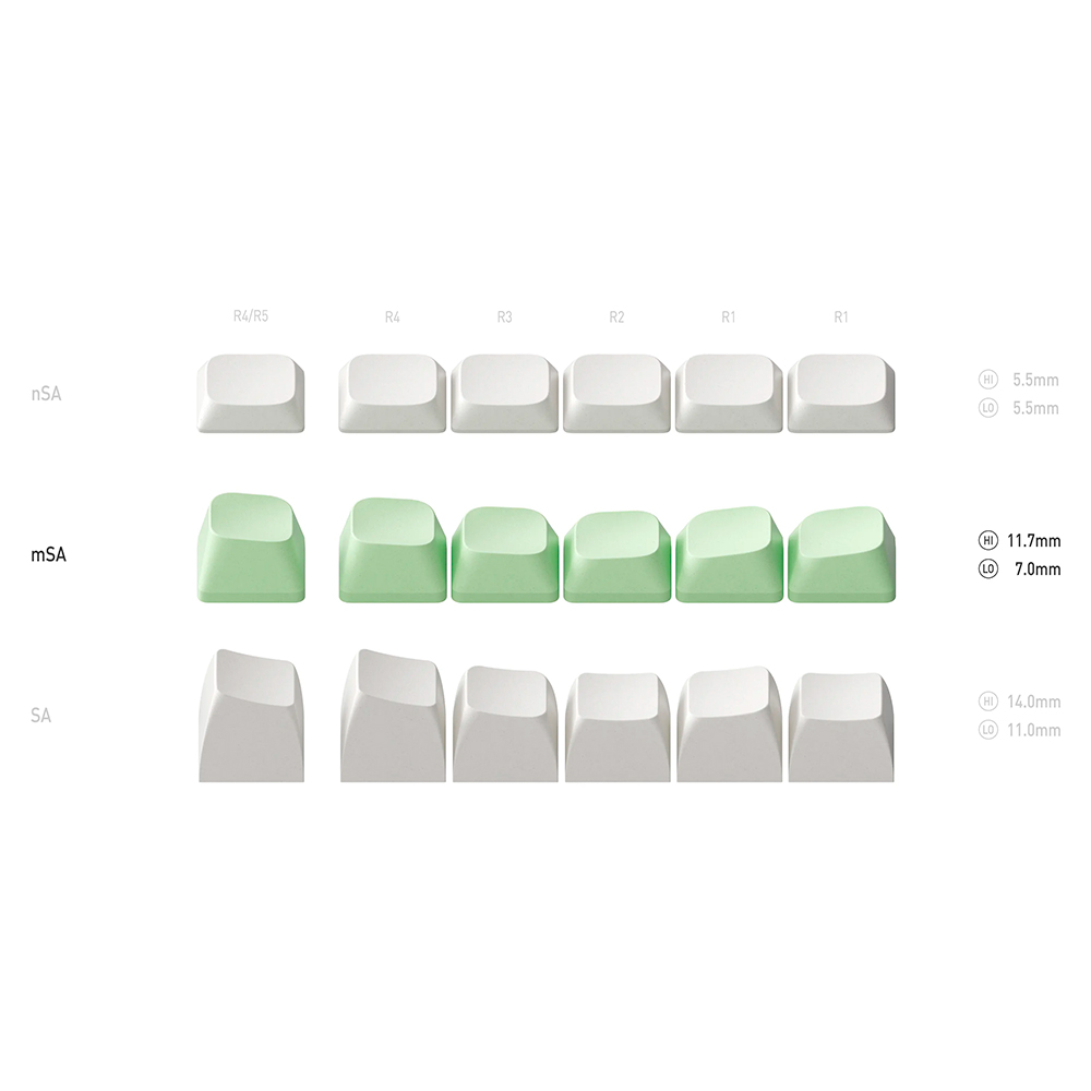 Lần đầu tiên, profile keycap mSA hoàn toàn mới được giới thiệu trên bàn phím cơ không dây Nuphy Halo96 V2 RGB Hotswap (Nuphy Sw) sau hơn hai năm phát triển. Đây là phiên bản high-profile được tinh chỉnh từ chiều cao của SA profile để tăng tính công thái học, với bề mặt tròn và lớn hơn cho cảm giác gõ thoải mái. Điểm độc đáo nhất chính là các thanh định vị (homing bar) có khả năng phát sáng, tận dụng LED mạch xuôi để chiếu sáng vừa đủ, giúp bạn định vị phím dễ dàng trong bóng tối mà không hề gây mất tập trung.