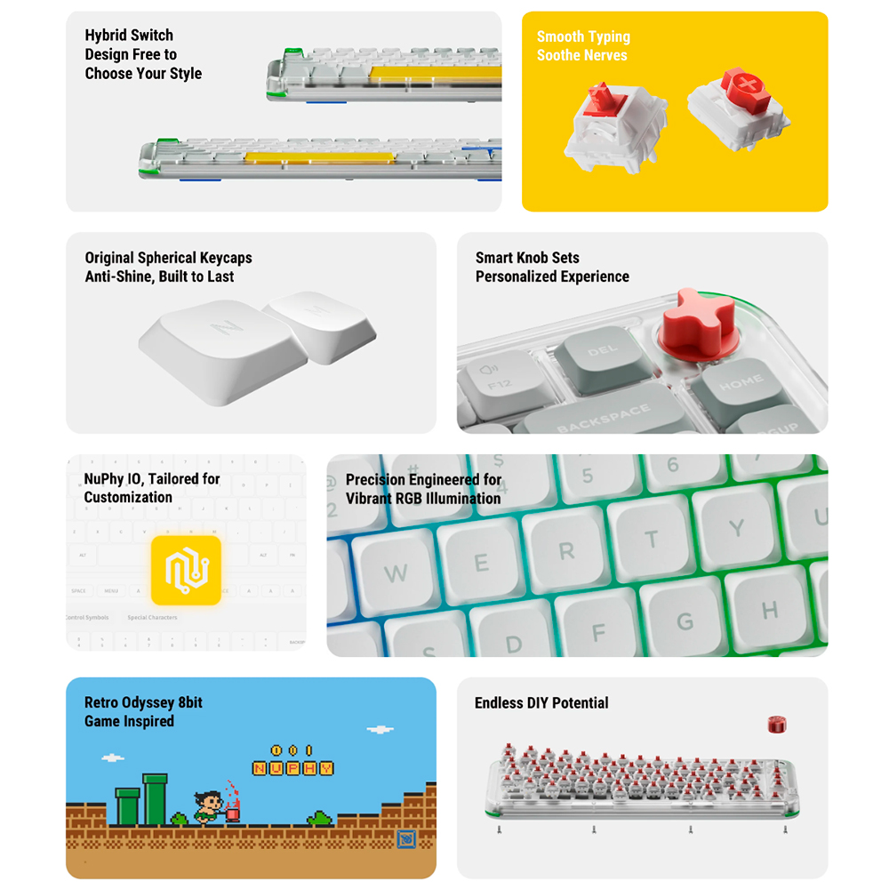 NuPhyIO mang đến trải nghiệm tùy chỉnh siêu đơn giản, hoàn hảo cho những ai yêu thích cá nhân hóa bàn phím. Với sự kết hợp giữa trợ lý web NuPhy IO và phần cứng thông minh như nút xoay (knob) cùng công tắc chuyển đổi (toggle switch), người dùng có thể chuyển đổi hệ điều hành mượt mà, thiết lập phím tắt theo ý muốn và thỏa sức bùng nổ sáng tạo. Nút xoay cho phép phóng to, thu nhỏ hình ảnh trên Photoshop một cách chính xác, mang lại sự kiểm soát tinh tế và cải thiện hiệu suất làm việc. Với lập trình viên, NuPhyIO hỗ trợ remap phím linh hoạt, ví dụ thay phím ·