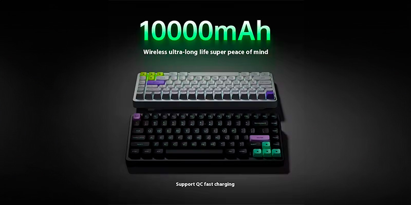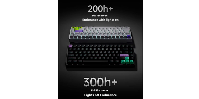 Bàn phím hỗ trợ kết nối 2.4GHz và USB-C có dây, mang lại độ ổn định cao và khả năng tương thích tốt với nhiều thiết bị. Với viên pin 10.000mAh, Aesco A83 có thể hoạt động liên tục lên đến 300 giờ khi tắt đèn nền và 200 giờ khi bật đèn nền, giúp người dùng làm việc và chơi game mà không lo gián đoạn.