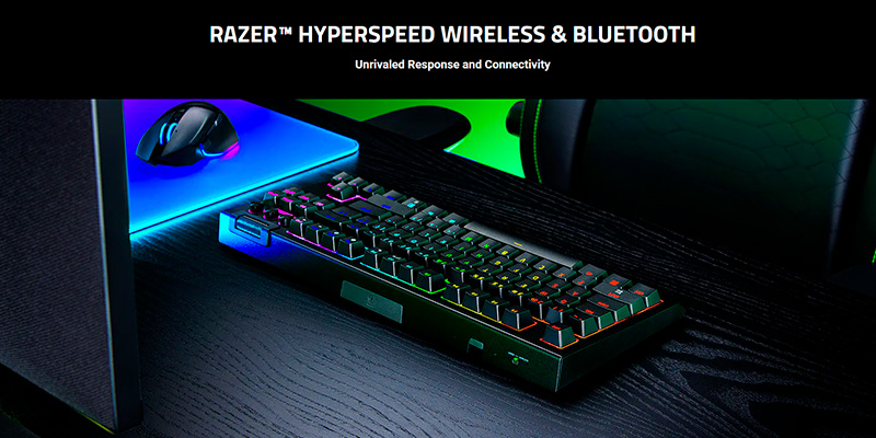 Điểm mạnh của bàn phím chính là Razer HyperSpeed Wireless 2.4GHz, công nghệ độc quyền mang lại độ trễ cực thấp, gần như ngang với bàn phím có dây. Ngoài ra, sản phẩm còn hỗ trợ Bluetooth đa thiết bị và cáp Type-C, cho phép linh hoạt chuyển đổi kết nối tùy theo nhu cầu. Với tần số phản hồi 1.000Hz, bàn phím đảm bảo từng phím bấm đều được ghi nhận nhanh chóng và chính xác, đặc biệt trong các tựa game esports đòi hỏi tốc độ.