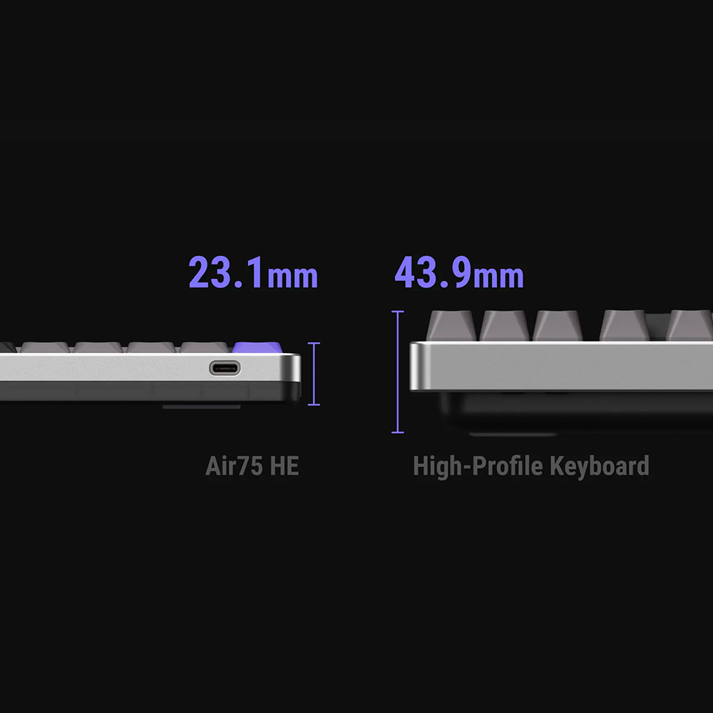 Với điểm kích hoạt chỉ 0.1mm, switch từ tính loại bỏ độ trễ debounce và rút ngắn hành trình nhấn từ 2.0mm của switch Red hay 1.1mm của switch Silver xuống còn 0.1mm. Không dùng tiếp xúc kim loại, bàn phím mang lại trải nghiệm gõ mượt mà và độ bền cao hơn đến 100% so với switch cơ truyền thống. Kết hợp với độ trễ chỉ 0.1ms cùng tần số phản hồi 8000Hz thực, Air60 HE trở thành bàn phím low-profile 75% đầu tiên trên thế giới đạt chuẩn này, mang đến tốc độ phản hồi nhanh gấp 50 lần so với bàn phím gaming thông thường.