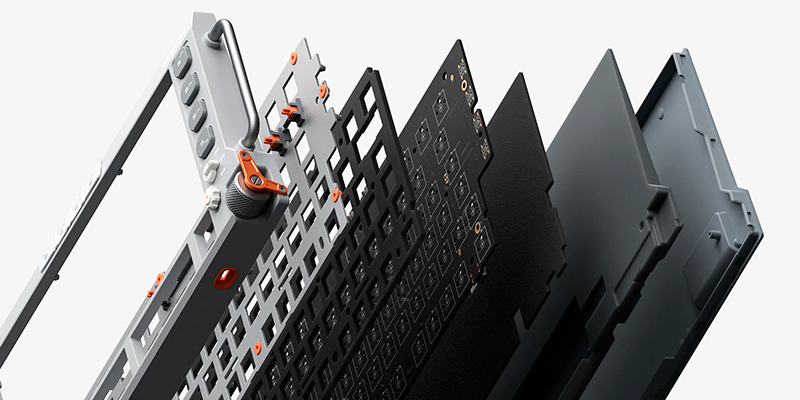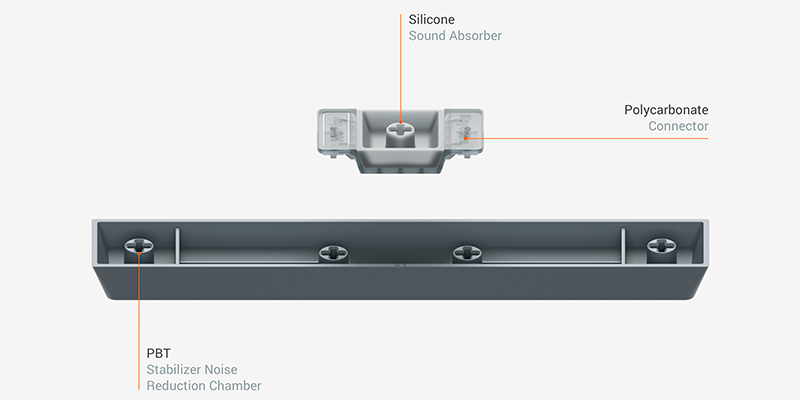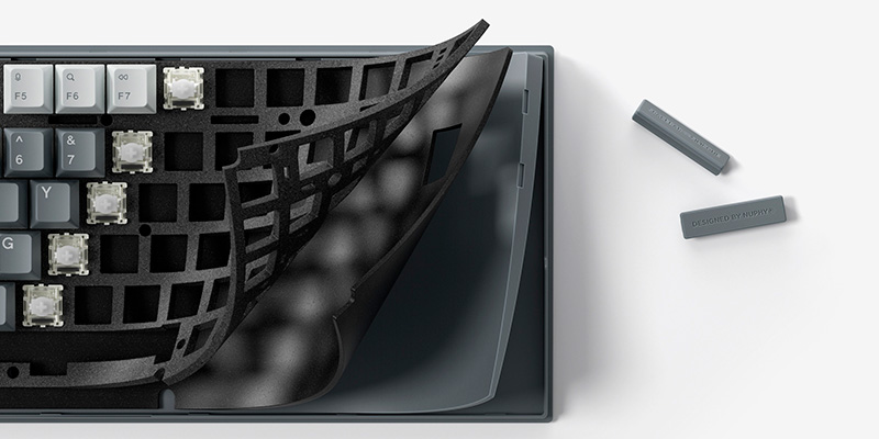 Nhờ các lớp silicone padding và wrap được đặt quanh vít lắp và các điểm tiếp xúc giữa khung cùng plate, bàn phím tạo ra độ đồng nhất âm thanh giống như gasket mount nhưng loại bỏ hoàn toàn các lỗi biến dạng. Cấu trúc âm học được tinh chỉnh đơn giản nhưng hiệu quả: hai lớp poron kết hợp với một plate nhôm kẹp giữa, cộng thêm một lớp silicone chống dội âm. Không có bí mật nào ở đây, tất cả đều rõ ràng như chính âm thanh mà bàn phím phát ra.