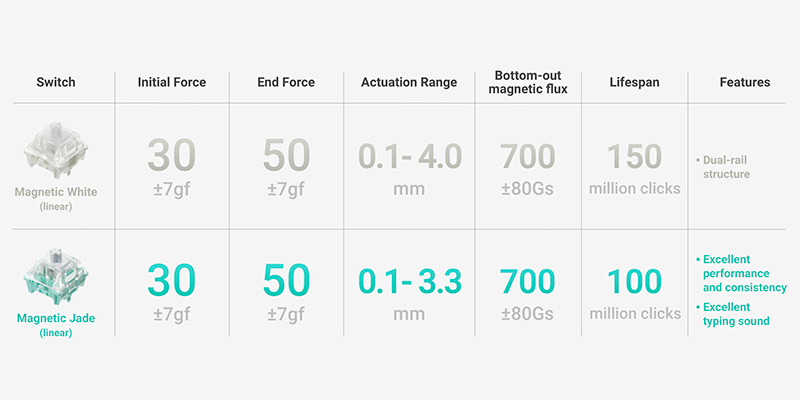 Được phát triển với công nghệ chế tạo thế hệ mới và bôi trơn sẵn (prelubing), switch từ tính Gateron Magnetic White mang lại trải nghiệm vượt xa các loại switch từ tính khác cả về cảm giác gõ lẫn âm thanh. Bên cạnh đó, người dùng cũng có thể lựa chọn Magnetic Jade – dòng switch đã trở thành chuẩn mực trong ngành nhờ hiệu năng cao và độ ổn định nhất quán. Với sự kết hợp này, Field HE không chỉ mang lại đa dạng tùy chọn mà còn đảm bảo mỗi lần nhấn phím đều chính xác, mượt mà và bền bỉ vượt trội.