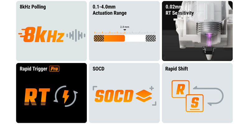 Phản xạ trung bình của con người là 300–500ms, game thủ chuyên nghiệp có thể đạt 200ms, nhưng một phím bấm thường mất hơn 100ms để ghi nhận do hành trình xuống điểm kích hoạt. Switch từ tính rút ngắn thời gian này một nửa nhờ kích hoạt tức thì bằng hiệu ứng Hall, tách biệt hoàn toàn với phản hồi xúc giác. Nếu bạn đam mê hiệu năng cực hạn, thì Rapid Trigger chính là tính năng dành cho bạn. Nhờ đó, mỗi thao tác đều trở nên nhanh hơn, chính xác hơn, giúp bạn luôn chiếm lợi thế trong từng khoảnh khắc quyết định.