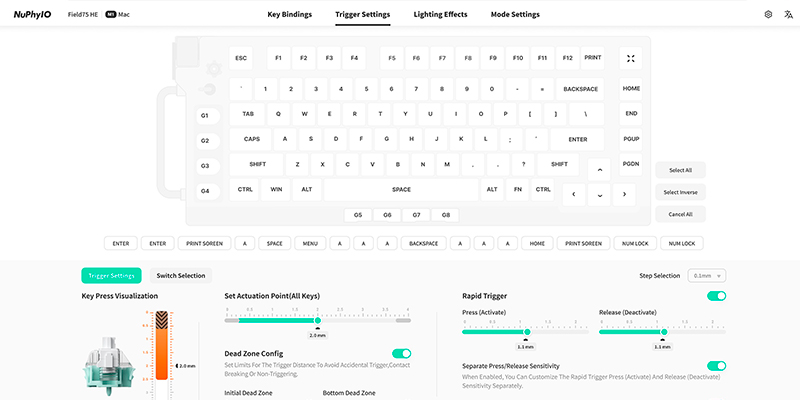 Việc tùy chỉnh thiết lập và thông số là yếu tố quan trọng tạo nên trải nghiệm bàn phím switch từ tính. Với cách tiếp cận thiết kế tương tác hoàn toàn mới, NuPhyIO giúp cho những tác vụ phức tạp này trở nên dễ dàng hơn, phù hợp cả với người dùng phổ thông lẫn chuyên nghiệp. Mọi thông số ảnh hưởng đến hiệu năng hệ thống đều có thể tùy chỉnh, và các điều chỉnh đó được hiển thị theo thời gian thực trên giao diện, chẳng hạn như ghi chú Rapid Trigger hoặc độ nhạy từng phím ngay trên bản xem trước của bàn phím.