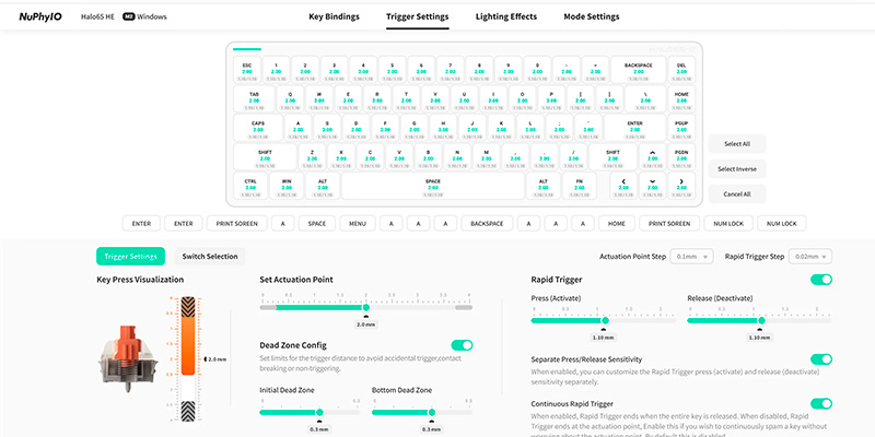 Trải nghiệm bàn phím từ tính trở nên hoàn hảo hơn khi đi kèm khả năng tùy chỉnh sâu các thiết lập và thông số. Với NuPhyIO cùng giao diện tương tác mới, việc chỉnh sửa vốn phức tạp nay được đơn giản hóa, phù hợp cho cả người dùng phổ thông lẫn game thủ chuyên nghiệp. Mọi thông số ảnh hưởng đến hiệu năng đều có thể tinh chỉnh theo thời gian thực, hiển thị trực tiếp trên giao diện với các chú thích rõ ràng như độ nhạy, rapid trigger trên từng phím. Điều này giúp người dùng dễ dàng kiểm soát và cá nhân hóa trải nghiệm, tối ưu bàn phím đúng theo phong cách và nhu cầu riêng.