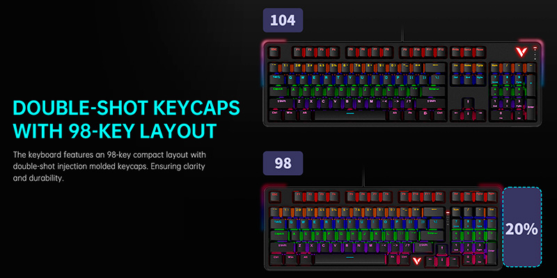 Keycap của Rapoo V500 Pro-98 sử dụng chất liệu PBT cao cấp, chống mài mòn và không bị bóng sau thời gian dài sử dụng. Ký tự được in sắc nét, khó phai, đem lại cảm giác gõ cứng cáp và chuyên nghiệp, đồng thời phù hợp với những người dùng yêu thích bàn phím cơ chất lượng thực thụ.