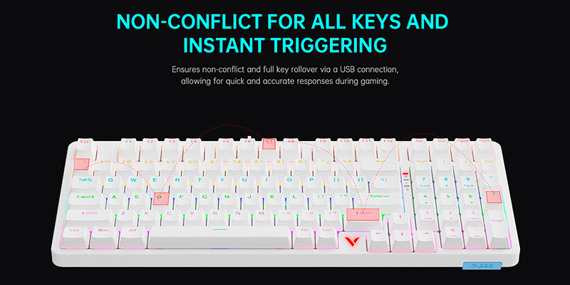 Với kết nối có dây chuẩn USB, Rapoo V500 Pro-98 đảm bảo độ trễ cực thấp, phản hồi cực nhanh, lý tưởng cho các tựa game đòi hỏi tốc độ xử lý cao. Công nghệ anti-ghosting 98 phím giúp bạn thực hiện nhiều tổ hợp phím cùng lúc mà không xảy ra hiện tượng xung đột – đặc biệt hữu ích khi chơi game hoặc làm việc với phần mềm chuyên dụng.