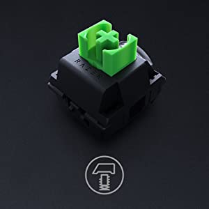 Switch Razer Green Keyswitch Razer Green hoạt động một cách êm ái nhưng vẫn tạo được phản hồi xúc giác (Tactile) kèm theo là tiếng Clicky mỗi khi nhấn phím, tạo ra độ chính xác cùng hiệu suất tốt nhất khi chơi game. Các switch được thiết kế để tăng độ ổn định và bảo vệ khỏi bụi cùng chất lỏng, đồng thời cho độ bền lên đến 80 triệu lần nhấn. |