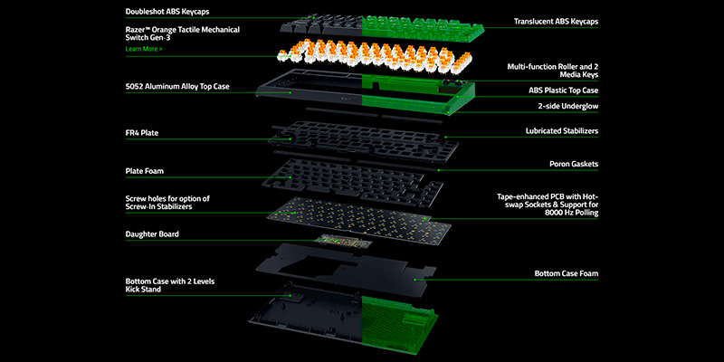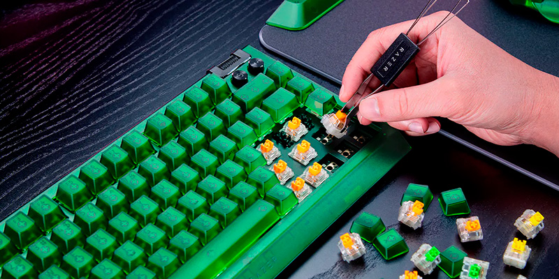 Điểm nổi bật đáng chú ý nhất chính là khả năng hot-swap, cho phép người dùng dễ dàng tháo và thay thế switch mà không cần hàn. Tương thích với cả switch 3 chân và 5 chân, bàn phím hỗ trợ tối đa game thủ cá nhân hóa trải nghiệm gõ phím với loại switch yêu thích. Bản gốc đi kèm Razer Orange Switch Gen-3, dạng tactile và yên tĩnh, phù hợp cho cả chơi game và làm việc trong môi trường yên tĩnh.