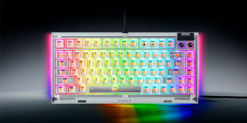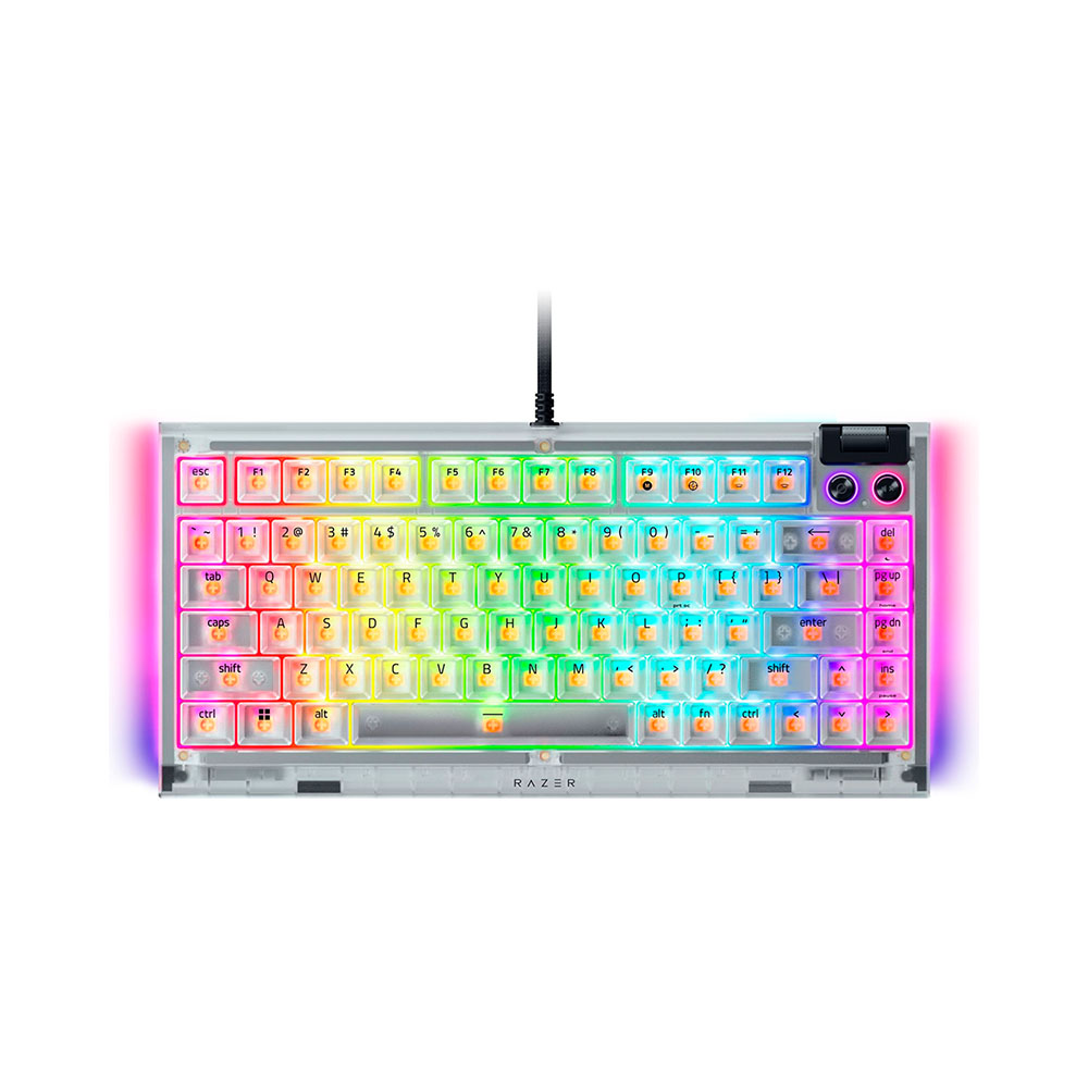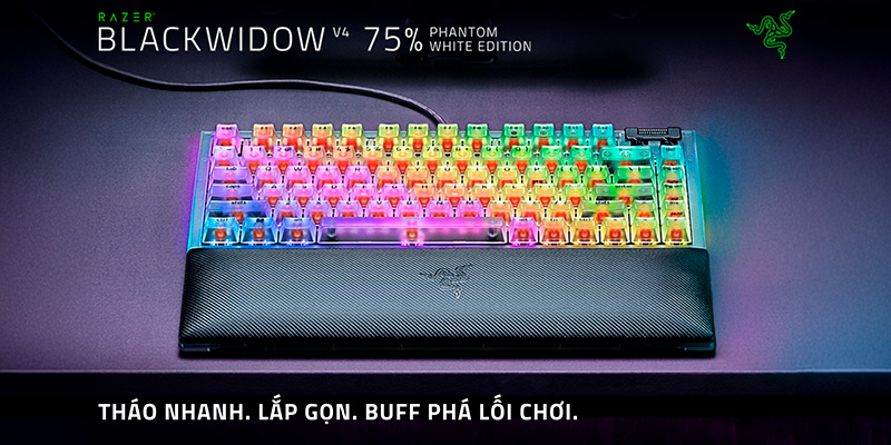 Bàn phím cơ Razer BlackWidow V4 75% Phantom White Edition RGB Hotswap Razer Switch Orange RZ03-05003500-R3M1 được thiết kế với layout 75% tối ưu hóa, giữ lại đầy đủ cụm phím chức năng và điều hướng trong một khung gọn gàng, lý tưởng cho game thủ hoặc người dùng văn phòng cần không gian làm việc tối đa. Thiết kế Phantom White bán trong suốt không chỉ nổi bật về thẩm mỹ mà còn giúp ánh sáng LED RGB lan tỏa rực rỡ hơn trong mọi góc độ sử dụng.