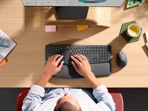 Thiết kế công thái học Logitech Ergo K860 For Business với thiết kế đặc biệt giúp việc gõ văn bản của bạn tốt hơn với thiết kế khung cong, chia đôi giúp cải thiện tư thế gõ. |