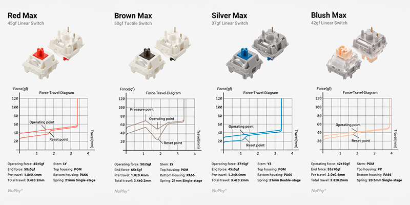 Các phiên bản trong bộ sưu tập NuPhy Max (như Red, Silver, Brown) đều được thiết kế với tổng hành trình (total travel) rút ngắn chỉ còn 3.4mm (so với 4.0mm của switch tiêu chuẩn truyền thống). Việc rút ngắn hành trình này giúp ngón tay của bạn chạm đáy (bottom-out) nhanh hơn, tạo ra âm thanh gõ (sound profile) vô cùng gọn gàng, dứt khoát và giòn giã (thường được giới chơi phím gọi là âm "thock" hoặc "clack" đặc trưng). Riêng bản Silent Blush Max duy trì hành trình 3.8mm để tối ưu không gian cho các đệm giảm chấn (dampener) hoạt động hiệu quả.
