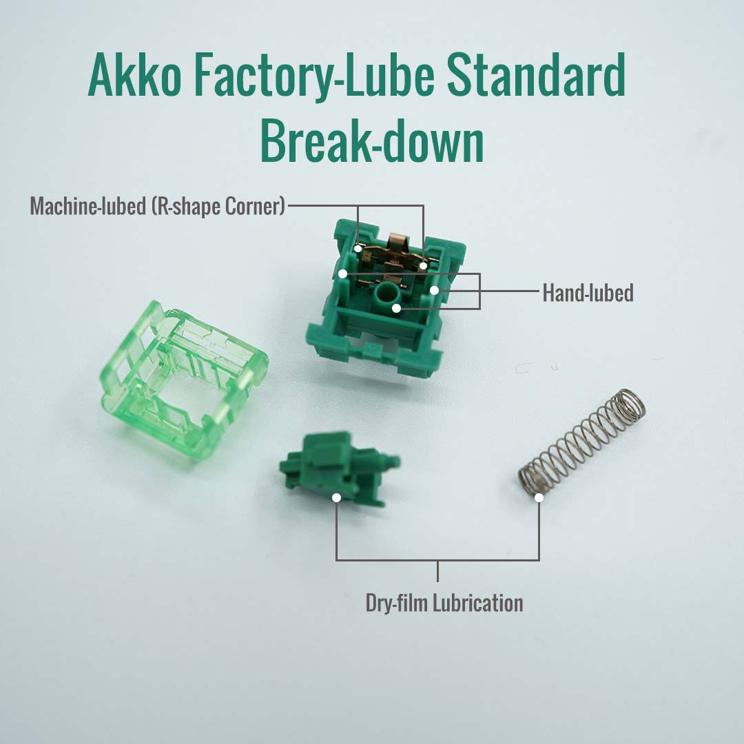 Trải nghiệm khác biệt Switch Akko CS Lavender Purple Lubed được lube tay, 2 thành 2 bên (Bottom Housing Stem Rail) và trụ lò xo sẽ được lube tay kết hợp với bôi trơn dạng khô (dry film lubrication) cho stem và lò xo cũng như lube máy ở các góc lá đồng giúp giảm ping lá đồng và tăng sự mượt mà hơn khi sử dụng. |