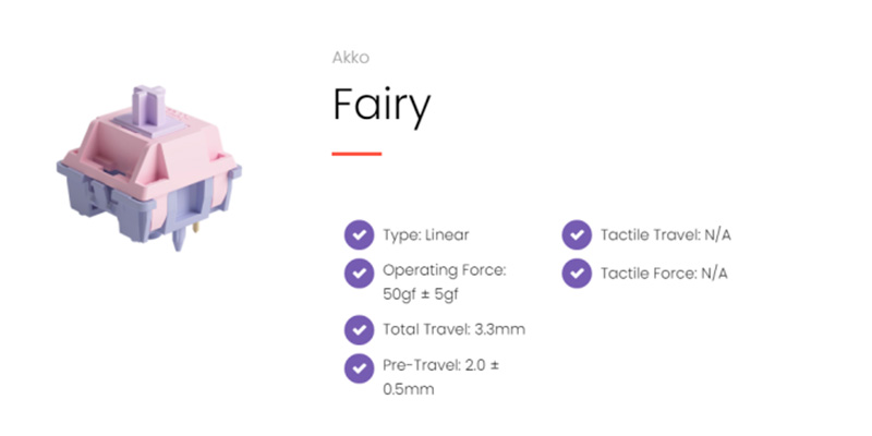 Akko Fairy Switch Silent được chế tạo từ các vật liệu chất lượng cao như POM cho phần stem và PA cho phần housing. Sự kết hợp này không chỉ mang lại độ bền cao mà còn đảm bảo tính ổn định trong suốt quá trình sử dụng. Người dùng có thể yên tâm về tuổi thọ của switch, với khả năng chịu đựng lên đến 50 triệu lần nhấn.