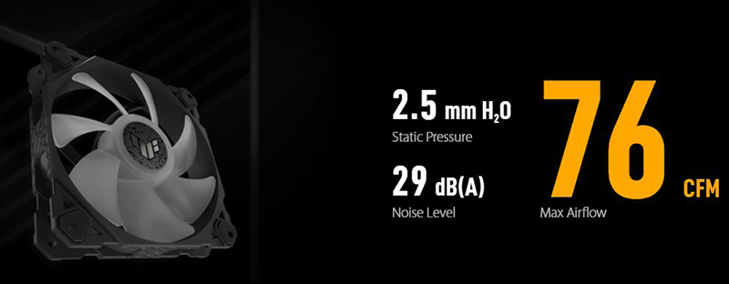 Cho tiếng ồn thấp Bộ ba Fan Case Asus TUF Gaming TF120 ARGB 120mm Black cung cấp hiệu suất làm mát vượt trội với cấu hình âm thanh được giảm thiểu ở mức cực thấp ở 29 dB(A) |