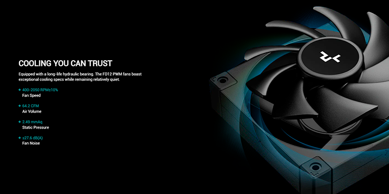 Fan sử dụng công nghệ vòng bi thủy lực có độ bền cao, giúp tăng tuổi thọ sản phẩm, giảm hao mòn và duy trì hiệu suất hoạt động liên tục trong thời gian dài. Đây là yếu tố quan trọng với các hệ thống làm việc hoặc chơi game kéo dài nhiều giờ mỗi ngày và yêu cầu ổn định lâu dài.