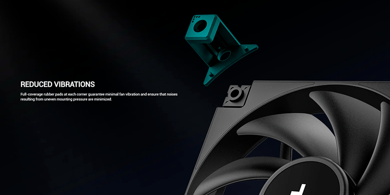 Mỗi quạt đều được trang bị đệm cao su chống rung ở cả bốn góc, kết hợp với thiết kế động cơ chất lượng cao giúp giảm thiểu tiếng ồn khi hoạt động ở công suất tối đa. Mức ồn chỉ khoảng 27.6 dB(A), cực kỳ yên tĩnh khi chạy đa tác vụ, livestream, làm việc văn phòng hoặc dựng phim trong môi trường cần sự tĩnh lặng.