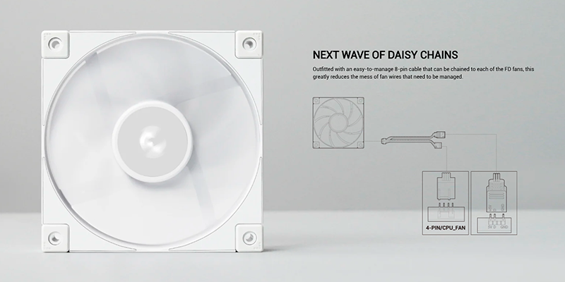 Fan Case Deepcool FD12 WH-3 IN 1 được trang bị dây kết nối daisy chain 8-pin mới, giúp liên kết nhiều quạt mà không cần quá nhiều dây nối rườm rà. Kiểu kết nối khối hộp chắc chắn hơn dòng FC trước đây, đảm bảo việc lắp đặt nhanh chóng, an toàn và trực quan hơn, đặc biệt phù hợp với người mới build PC hoặc builder chuyên nghiệp.