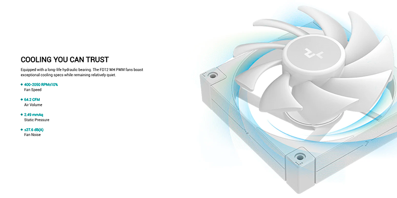 Sử dụng vòng bi thủy lực chất lượng cao, mỗi quạt trong bộ ba Fan Case Deepcool FD12 WH-3 IN 1 có tuổi thọ lâu dài, khả năng vận hành mượt mà và tiết kiệm năng lượng. Thiết kế này giúp duy trì hiệu suất ổn định theo thời gian và hỗ trợ hoạt động liên tục trong các hệ thống yêu cầu khắt khe về hiệu năng làm mát.
