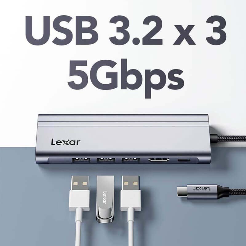 3 x Cổng USB-A 3.2 Bộ chia USB Type-C 7-in-1 Lexar H31 LPAH31N-RNHNG cũng không thể thiếu cổng USB Typs-A truyền thống, giúp bạn kết nối với chuột, bàn phím hoặc ổ cứng ngoài. Những cổng này cũng có thể dùng để sạc các thiết bị như iPhone và tai nghe Bluetooth. |