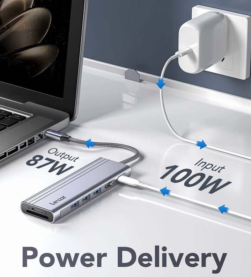 Công nghệ sạc PD 100W Bộ chia USB Type-C 7-in-1 Lexar H31 LPAH31N-RNHNG trang bị cổng sạc USB-C hỗ trợ công suất lên đến 100W, vì vậy bạn có thể luôn sạc máy tính xách tay hoặc điện thoại thông minh của mình và sẵn sàng làm việc . |