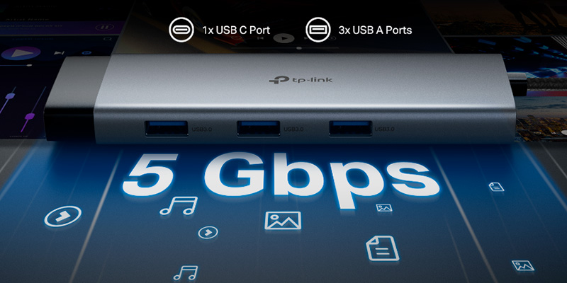 Bộ chia này bổ sung thêm 1 cổng dữ liệu USB-C và 3 cổng dữ liệu USB-A, tất cả đều hỗ trợ chuẩn USB 3.0 với tốc độ truyền dữ liệu lên đến 5 Gbps. Bạn có thể dễ dàng kết nối và truyền tải dữ liệu từ các thiết bị như ổ cứng di động, USB flash, chuột, bàn phím và nhiều thiết bị khác một cách nhanh chóng và hiệu quả.