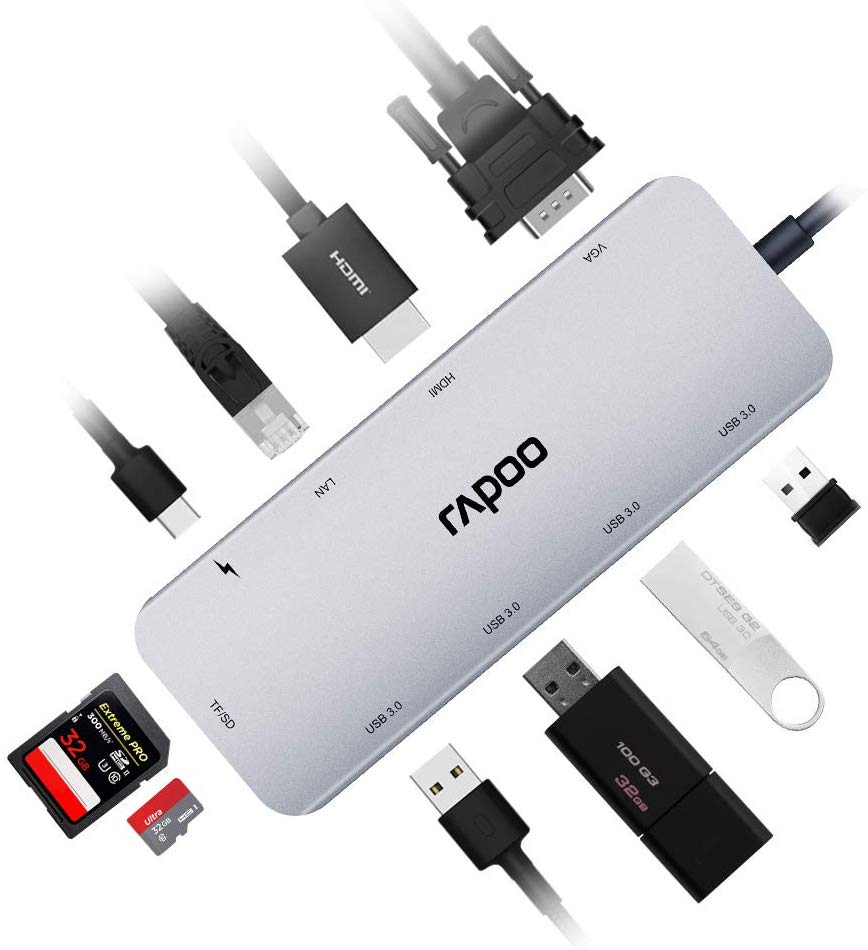 Bộ chia USB Type-C Rapoo 10-in-1 ra HDMI - Vga - USB 3.0 - USBTypeC - LAN - CardReader XD200