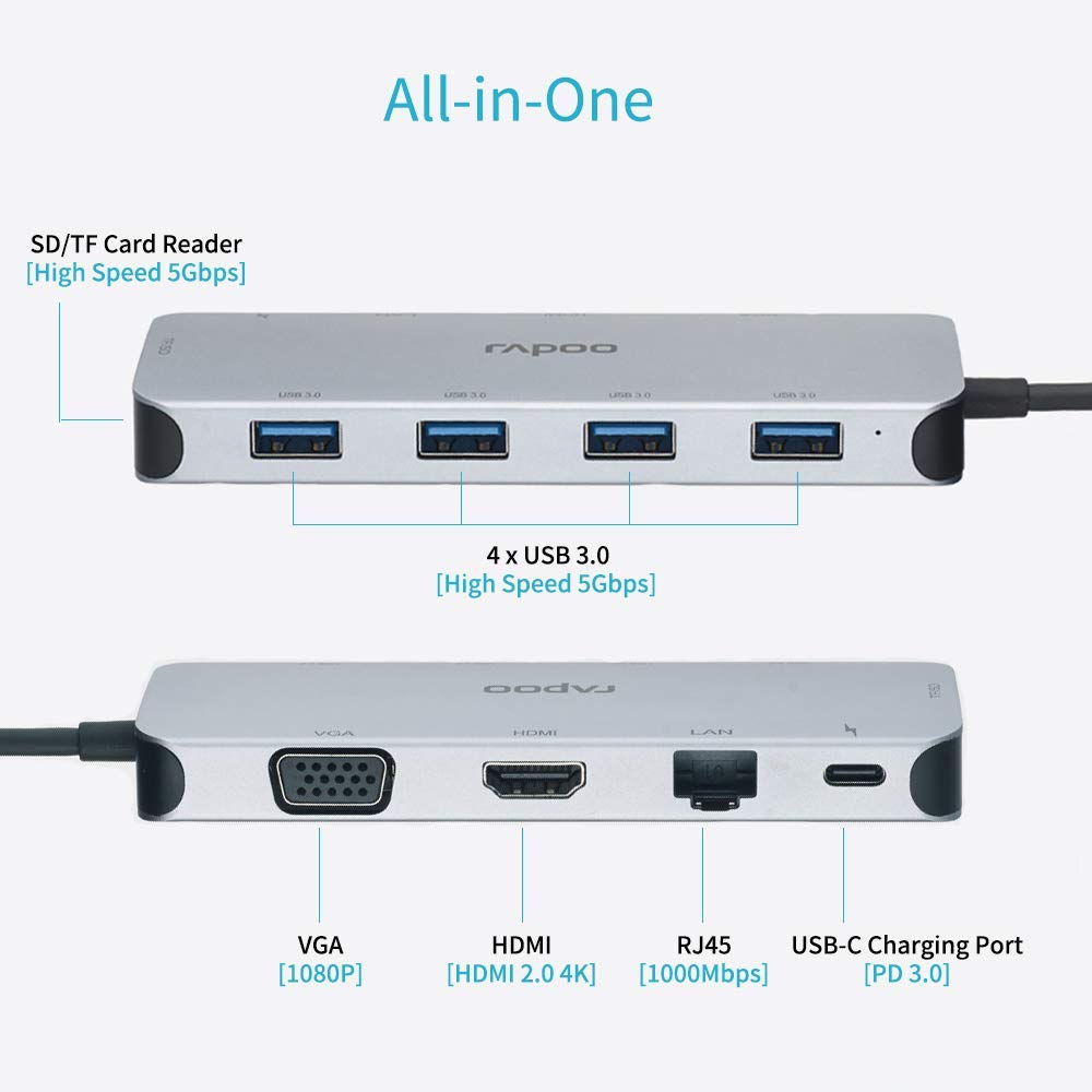 Bộ chia USB Type-C Rapoo 10-in-1 XD200 Dễ dàng mở rộng kết nối Với công nghệ ngày càng phát triển thì các dòng Macbook hoặc Laptop bắt đầu mỏng dần đi và các cổng kết nối đều được thu gọn và thay thế với chuẩn USB Type-C mới nhất và siêu nhỏ. Điều đó sẽ làm cho máy tính của bạn trông gọn gàng hơn nhưng sẽ cực kỳ khó sử dụng vì thiếu cổng kết nối. Thì điều bạn cần phải quan tâm đó là một thiết bị có thể giúp bạn mở rộng các cổng kết nối để sử dụng chuột, USB hoặc bất kì một thiết bị nào đó có giao tiếp USB. Xin giới thiệu đến bạn một sản phẩm có thể giúp bạn giải quyết vấn đề đò: Bộ chia USB Type-C Rapoo 10-in-1 XD200 với khả năng mở rộng tối đa. |