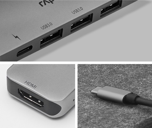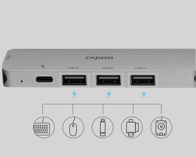 Cổng USB 3.0 Bộ chia USB Type-C Rapoo 5-in-1 XD100 hỗ trợ 3 cổng USB 3.0 Type-A giúp bạn sử dụng các thiết bị kết nối USB cũ như chuột, bàn phím, USB lưu trữ,... |
