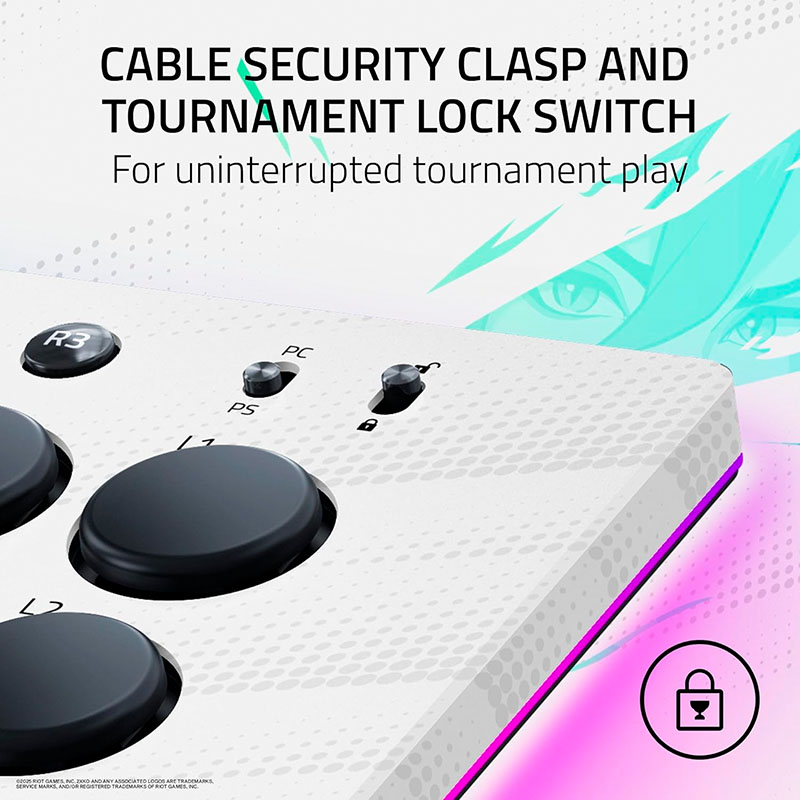 Razer Kitsune 2XKO Edition được trang bị cáp khóa an toàn và công tắc Tournament Lock, giúp cố định kết nối và vô hiệu hóa các nút không cần thiết trong khi thi đấu, tránh tình trạng nhấn nhầm hoặc mất kết nối giữa trận. Cấu trúc bền chắc, chân đế cao su chống trượt và bố cục nút được tính toán kỹ lưỡng giúp game thủ yên tâm tập trung vào từng pha di chuyển mà không lo thao tác sai. Đây là những chi tiết nhỏ nhưng cực kỳ quan trọng cho môi trường thi đấu chuyên nghiệp.
