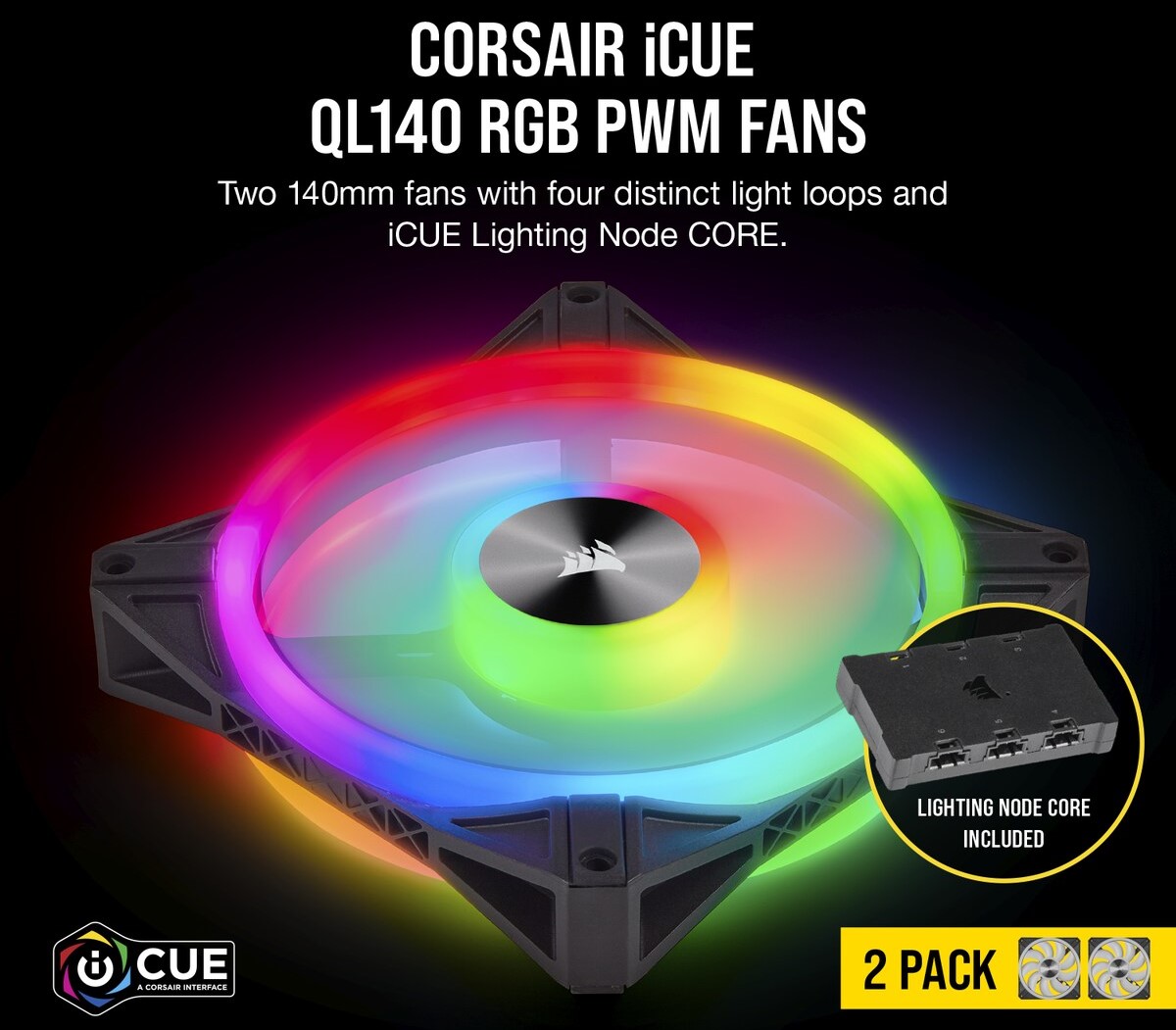 Bộ hai Fan Case Corsair QL140 RGB 140mm Black with Lighting Node Màu sắc nổi bật Bốn vùng chiếu sáng và 34 đèn LED trên mỗi quạt tạo ra màu sắc và hiệu ứng lôi cuốn ở hai bên mặt, cho ánh sáng ngoạn mục bất kể chúng được sử dụng để hút hay xả. |