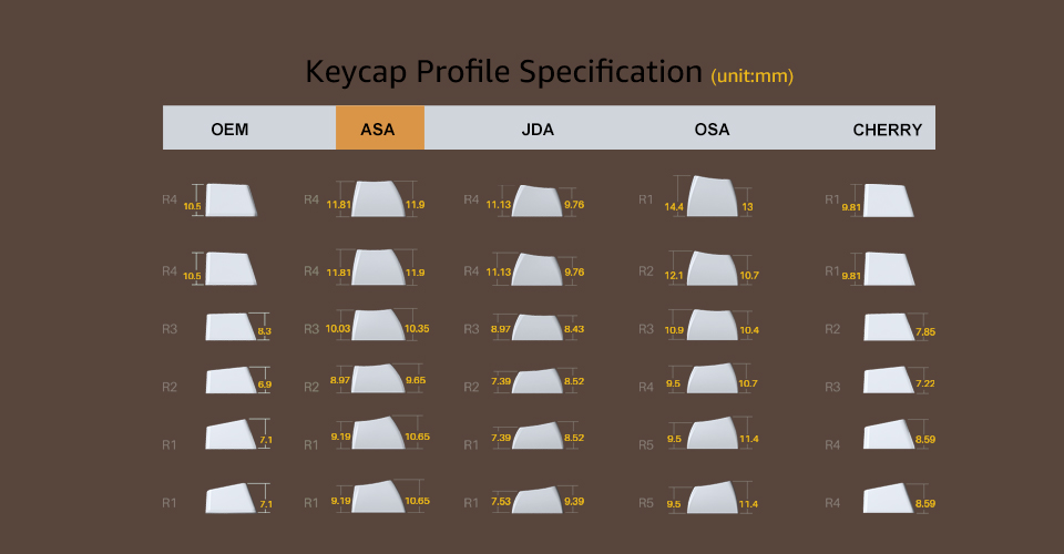 Bộ Keycap Akko Chocolate PBT Double-Shot ASA Profile ASA Profile Độ cao của ASA Profile sẽ thấp hơn OSA Profile nhưng lại cao hơn 1 chút so với OEM Profile, mang đến cảm giác thích thú khi trải nghiệm. Ngoài ra ASA Profile đã giải quyết được vấn đề rung lắc là nhược điểm chí mạng của OSA Profile và đem lại cho cảm giác vô cùng mới lạ so với OEM profile mà chúng ta thường sử dụng. |