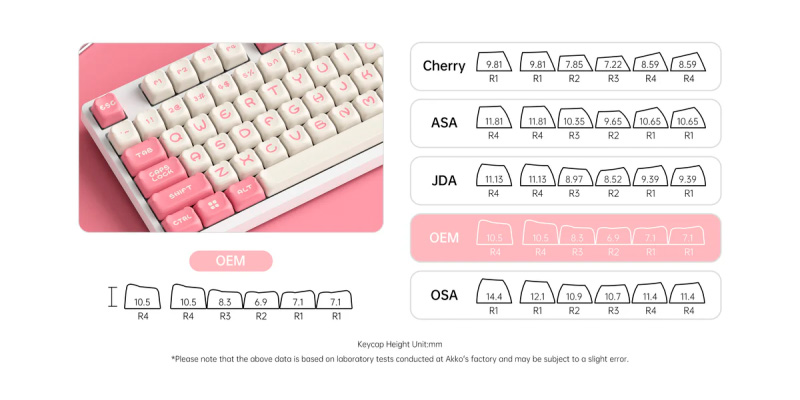 Bộ Keycap Akko Dim Sum Bear PBT Dyesub OEM Profile sử dụng OEM Profile – một thiết kế phổ biến với chiều cao vừa phải và độ cong hợp lý, mang lại cảm giác gõ phím mềm mại và thoải mái hơn. Thiết kế này không chỉ nâng cao trải nghiệm gõ mà còn tạo điểm nhấn thẩm mỹ độc đáo cho bàn phím của bạn.