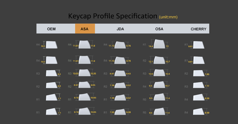 Bộ Keycap Akko Matcha Red Bean PBT Double-Shot ASA Profile ASA Profile Độ cao của ASA Profile sẽ thấp hơn OSA Profile nhưng lại cao hơn 1 chút so với OEM Profile, mang đến cảm giác thích thú khi trải nghiệm. Ngoài ra ASA Profile đã giải quyết được vấn đề rung lắc là nhược điểm chí mạng của OSA Profile và đem lại cho cảm giác vô cùng mới lạ so với OEM profile mà chúng ta thường sử dụng. |