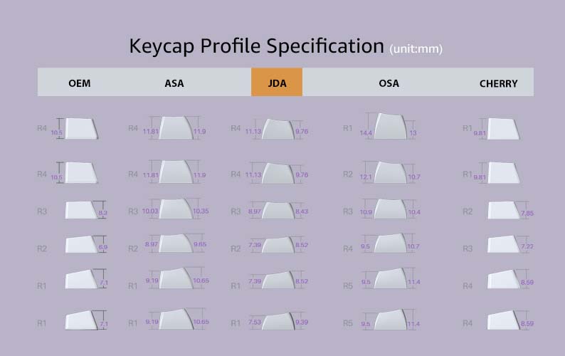 Bộ Keycap Akko Provence PBT Double-Shot JDA Profile JDA Profile Độ cao của JDA Profile sẽ thấp hơn OEM Profile và được được thiết kế bo cong để mang đến cảm giác thích thú khi trải nghiệm. Ngoài ra JDA Profile đã giải quyết được vấn đề rung lắc đem lại cho cảm giác vô cùng mới lạ so với OEM profile mà chúng ta thường sử dụng. |