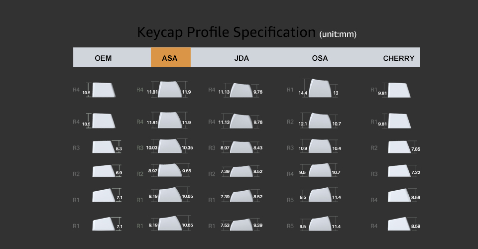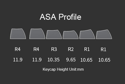 Bộ Keycap Akko Red & Blue Samurai PBT Double-Shot ASA Profile ASA Profile Độ cao của ASA Profile sẽ thấp hơn OSA Profile nhưng lại cao hơn 1 chút so với OEM Profile, mang đến cảm giác thích thú khi trải nghiệm. Ngoài ra ASA Profile đã giải quyết được vấn đề rung lắc là nhược điểm chí mạng của OSA Profile và đem lại cho cảm giác vô cùng mới lạ so với OEM profile mà chúng ta thường sử dụng.  |