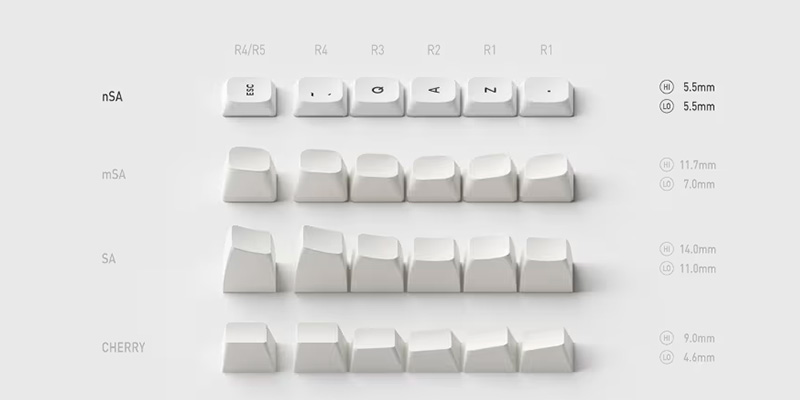 Nuphy BoW PBT Double-shot sử dụng profile nSA, kết hợp giữa sự thoải mái của SA truyền thống và sự hiện đại của profile thấp. Thiết kế này mang lại trải nghiệm gõ phím mượt mà, giảm thiểu áp lực lên ngón tay khi gõ trong thời gian dài, đồng thời giúp thao tác nhanh và chính xác hơn.