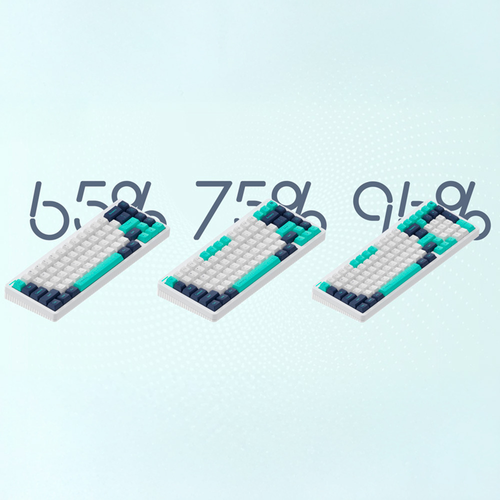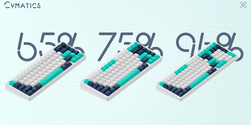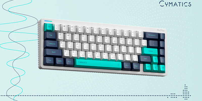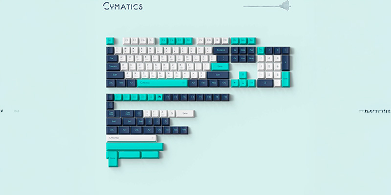 Được tạo ra từ sự hợp tác độc đáo giữa NuPhy và nhà thiết kế Suda, "Cymatics" là một dự án nghệ thuật lấy cảm hứng từ hình ảnh trực quan của sóng âm. Điểm nhấn ấn tượng nhất của bộ phím là các ký tự chữ cái được in kèm biểu đồ dạng sóng (waveform) tương ứng ngay bên dưới, kết hợp cùng các phím chức năng (novelties) mô phỏng lại các họa tiết âm học Chladni tuyệt đẹp. Ở phiên bản Cymatics Bright, bộ phím khoác lên mình dải màu tươi sáng pha trộn giữa Trắng, Xanh ngọc (Turquoise) và Xanh chàm (Indigo), mang đến một diện mạo hiện đại, đậm chất khoa học viễn tưởng (sci-fi) cho không gian làm việc.