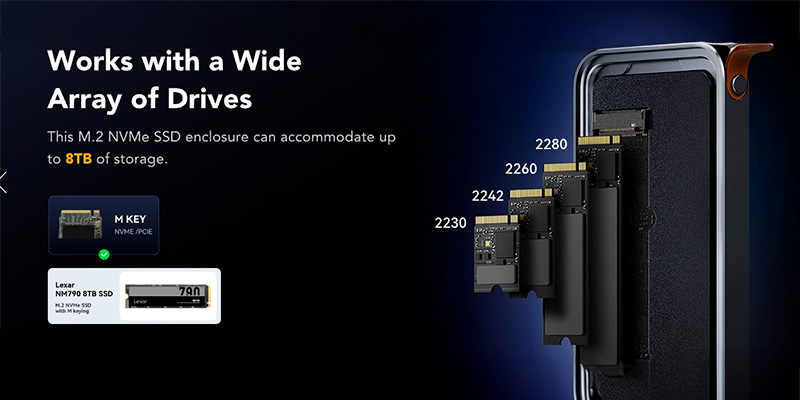 Sản phẩm hỗ trợ các ổ M.2 NVMe chuẩn M key với các form factor 2280, 2260, 2242 và 2230, dung lượng tối đa lên tới 8TB. Người dùng có thể dễ dàng chuyển đổi ổ SSD cũ thành ổ lưu trữ di động tốc độ cao chỉ trong vài giây với thiết kế lắp đặt không cần dụng cụ.